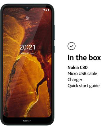 | Whats in the box | 5V2A Charger, Nokia C30 device, Quick Start Guide, Safety Booklet |